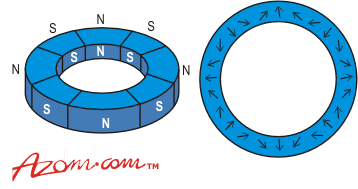 图3。左边是一个传统的环形磁铁用于主轴电机在计算机磁盘驱动器中,由键8弧形磁铁。右边是一个示意图类似的文章在一块通过燃烧合成应用领域,与内部磁场方向模拟左边的项。 |